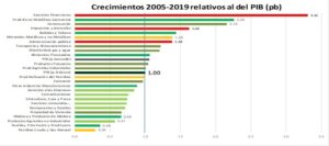 Respecto al crecimiento global del PIB, entre 2006 y 2019 crecieron sectores que menos deberían crecer: los servicios financieros, 3,31 veces más que el PIB; los impuestos 1,62 veces, y la administración pública 1,4 veces más.