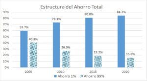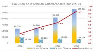 Por ejemplo, los hogares han reducido sus saldos en ahorro y han aumentado su deuda: el ahorro por cuenta en el 1% de las cuentas “más gordas” es del orden de Bs 1,7 millones; en el resto -el 99% de cuentas, el ahorro promedio por cuenta cae de Bs 9.700 en 2005 a Bs 2.700 en 2020; la relación de montos entre ahorro del 1% respecto al 99%, sube de 246 a 636 veces.